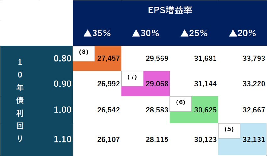 下のマトリックスの(7)は、日経平均3万円割れ、長期金利1%割れで3割減益を織り込む水準である。非常にキリがいいので、ここがひとつの有力な底値目途となるだろう。もう一度いうので、日経平均3万円割れ、長期金利1%割れ、3割減益の水準と覚えてください(日経平均3万円割れ、長期金利1%割れの下限が(7)の2万9,000円、長期金利0.9%である)。