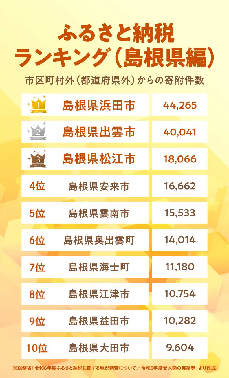 日本の地方自治体を支援するための寄付制度である「ふるさと納税」。楽しみなのはやっぱり返礼品。寄付先の自治体から地域の特産品や名産品の数々をゲットできて、しかも地域貢献までできると一石二鳥。今回は総務省がまとめた「2023年度の市区町村外からの寄付件数」に基づいて「島根県」のふるさと納税ランキングを発表。寄付件数の多い順にベスト10を発表します。