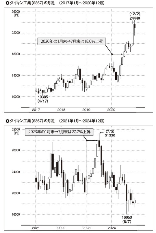 季節性が顕著なシーズンストックとしてよく例に出されるのは、エアコン株でしょう。業界の世界的な企業はダイキン工業(6367)ですが、上の表は過去6年(2019~2024年)における真冬(シーズンオフの1月末)と真夏(シーズンインの7月末)の終値を比較したものです。