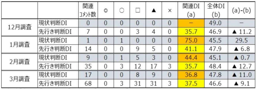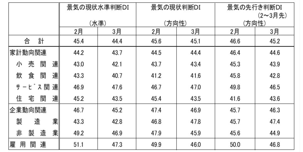 なお、原数値でみると、3月現状判断DIは前月差2.7ポイント上昇の47.8でこちらは上昇になっています。一方、先行き判断DIは前月差1.8ポイント低下の46.6と原数値でも低下しました。
