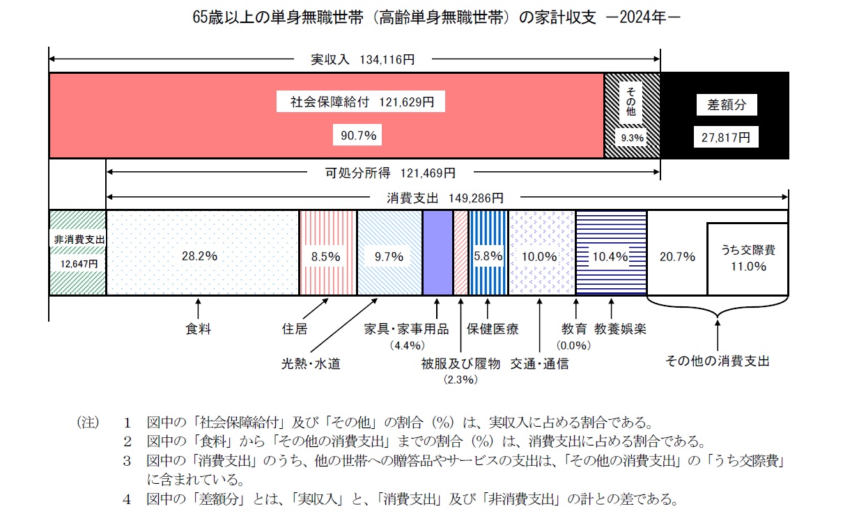 総務省「家計調査報告(家計収支編)2024年(令和6年)平均結果の概要」によると、65歳以上の無職世帯の単身世帯の収支は、実収入が13万4,116円、可処分所得が12万1,469円、消費支出が14万9,286円となっています。