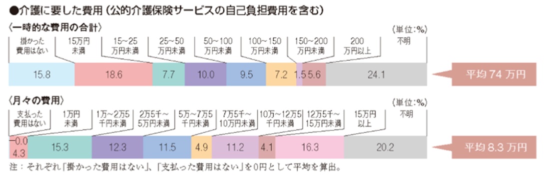 公益財団法人生命保険文化センターの調査によると、介護が必要になった際にかかる一時的な費用の平均は約74万円、毎月の介護費用の平均は約8.3万円となっています。