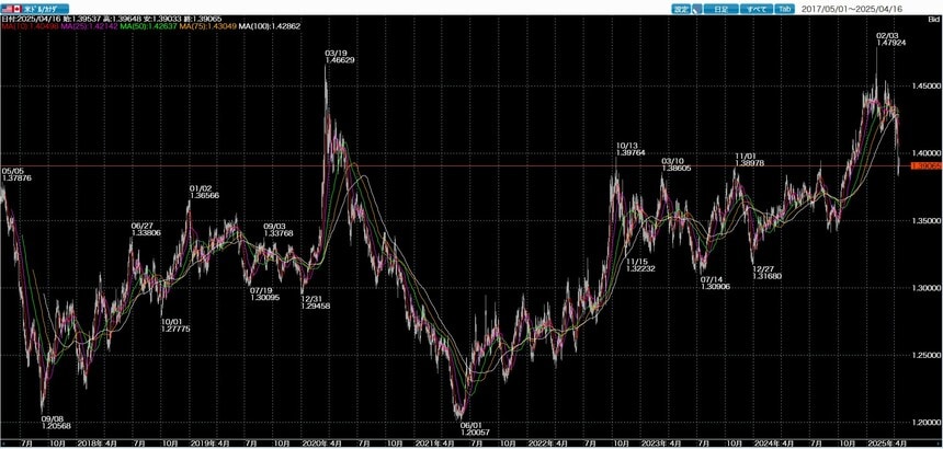 2024年末時点では1.38〜1.42ドル台へドル高方向に上昇しました。