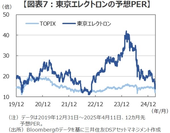 4月11日に米政府はスマートフォン、パソコン、半導体製造装置などについて、相互関税の対象から除外すると発表しました。今後の詳細は来週中にも発表される模様ですが、米中による覇権争いの最前線となってきた半導体業界は、これまで大きな売り圧力にさらされてきました。このため、米フィラデルフィア半導体株指数の12カ月先予想PERは一時16.4倍まで低下し、長期的な利益の成長性で見劣りするS&P500種指数の平均値を下回っています。そして、その余波は日本の半導体関連株にも及んでいて、日本最大の半導体製造装置メーカーである東京エレクトロンの予想PERも、一時14倍台をつけるなど大きく低下しています[図表7]。