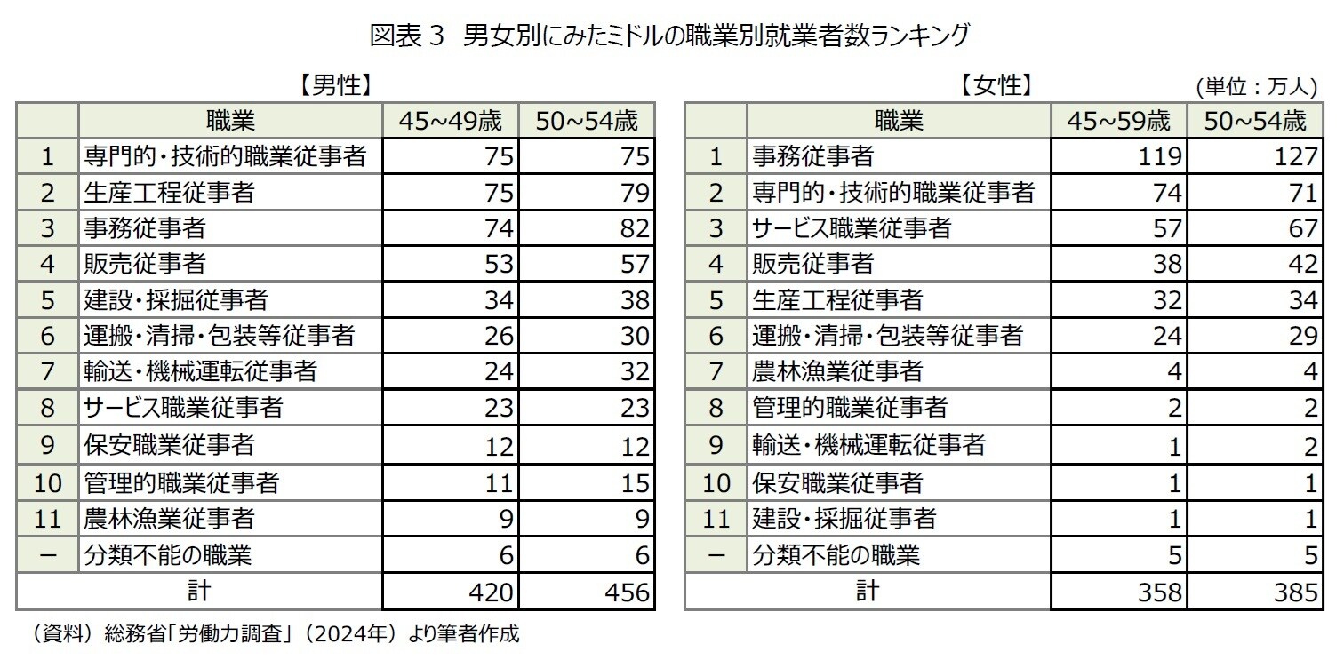 次に、ミドルが就いている具体的な職種を確認する。同じく総務省の「労働力調査」(2024年)より、「45~49歳」と「50~54歳」の就業者数を職業別にランキング(「45~49歳」の就業者数による順位付け)したものが[図表3]である。なお、「就業者」には、自営業者や企業の役員なども含まれる。