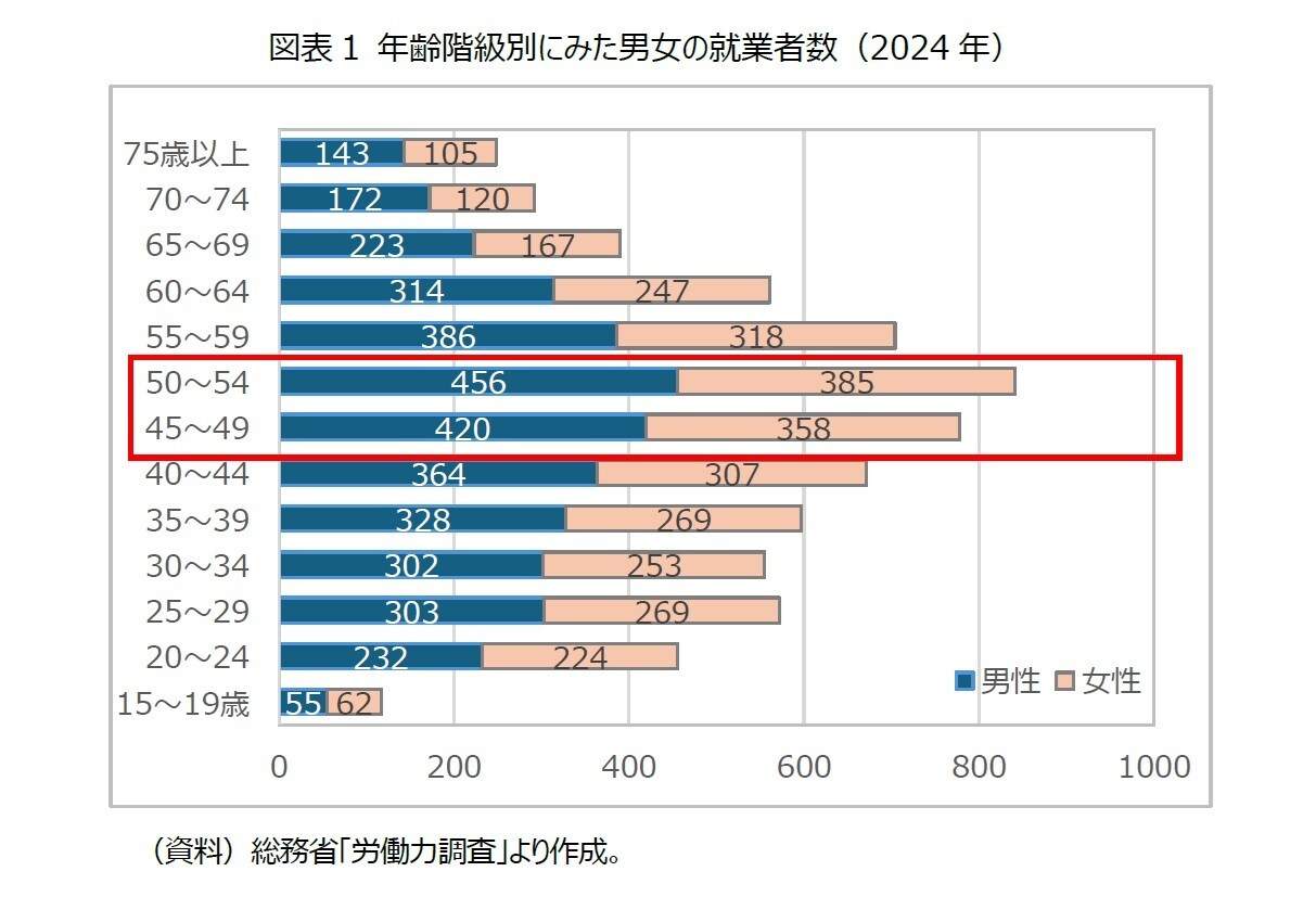 因みに、年間出生数が120万人前後に低下した「25~29歳」の階級だと、就業率は「50~54歳」と大きな差はないが、就業者数は男女合わせて572万人に減少する。このような急激な少子化が、各産業に人手不足をもたらし、ミドルシニアに対する採用拡大につながっていると言える。