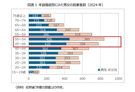 ミドルの転職状況について分析する前に、現状でのミドルの就業状況を確認しておきたい。この世代の最大の特徴は、年間出生数が200万人を超えていた「団塊ジュニア世代」が、50代前半に含まれているため、他の世代に比べて就業者数が多いことである[図表1]。総務省の「労働力調査」(2024年)によると、「50~54歳」の就業者数は、男女合わせると841万人で、すべての年齢階級の中で最大である。また、より上の世代に比べると、女性の社会進出が進み、女性の就業率が上昇したことも特徴である。男女別、年齢階級別のミドルの就業者数や就業率などは[図表2]に示した。
