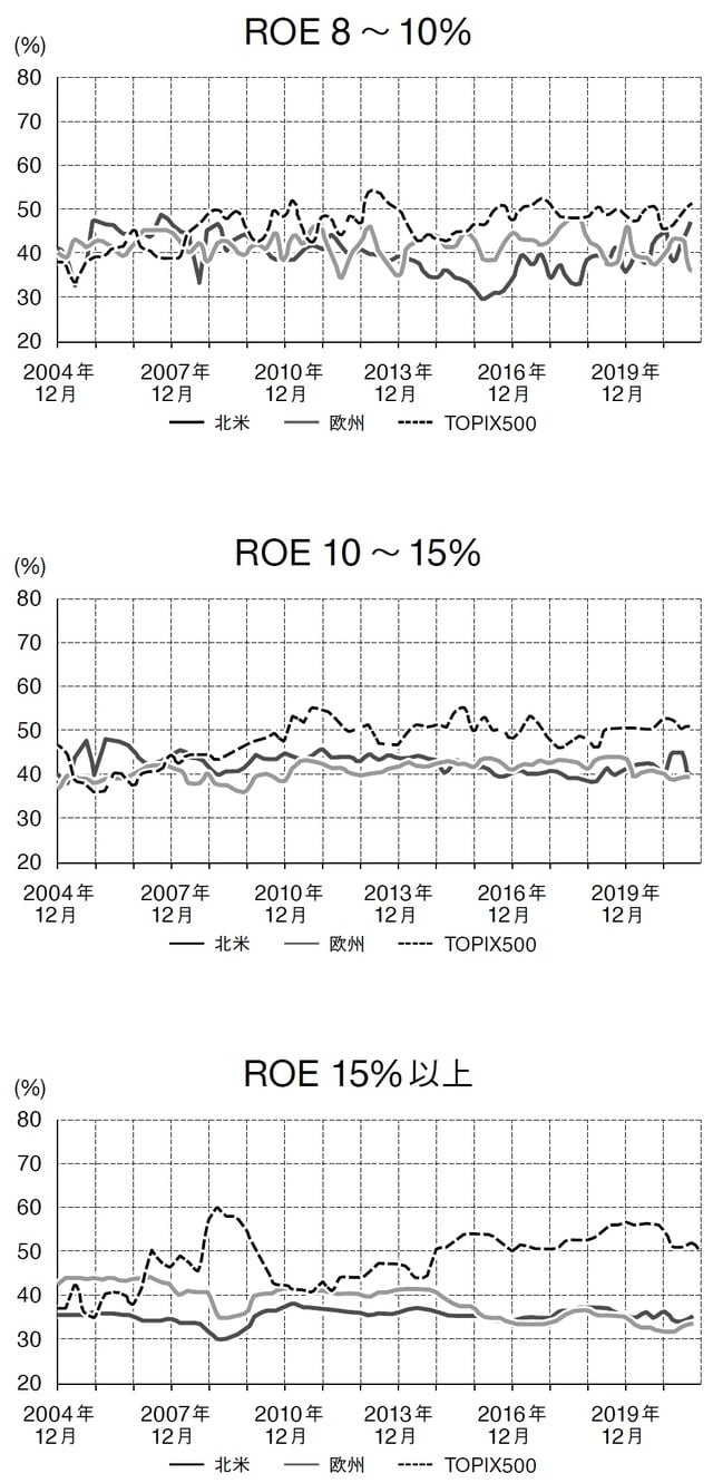 ROEとROAのギャップの原因は、レバレッジ(株主資本/総資産、「自己資本比率」)である。ROA8%未満では、日本とその他の市場でレバレッジの差はない。しかしROA8%以上では、日本の自己資本比率は他の先進国に比べかなり高い水準となっている(図表6)。