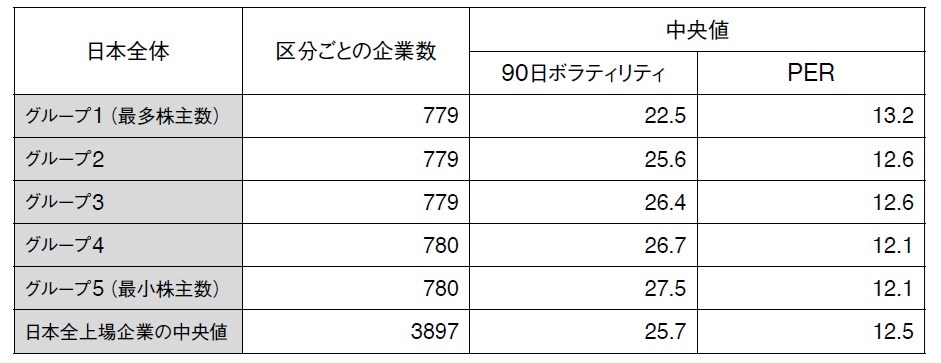 株主が最も多い企業群のボラティリティが最も低く、またバリュエーションが高いことがわかる。