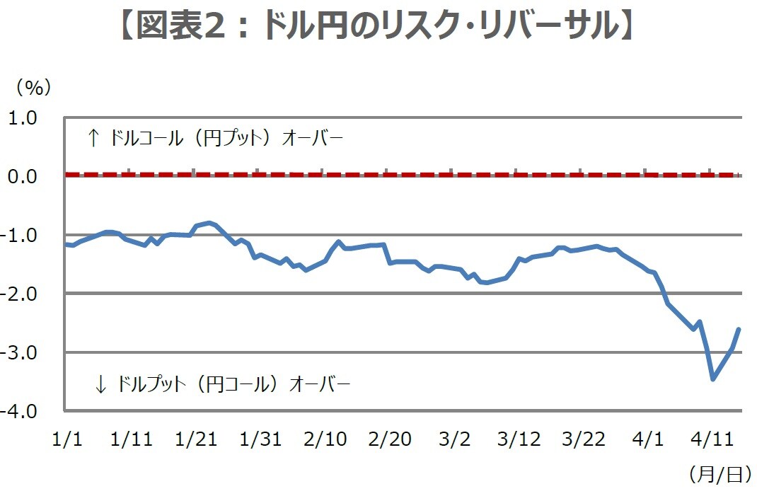 こうしたなか、通貨オプション戦略の1つである「リスク・リバーサル(満期日、想定元本、デルタが同じアウト・オブ・ザ・マネー(OTM)のコールとプットを組み合わせて反対売買する取引)」をみると、ドルプット(円コール)オーバーとなっていることがわかります(図表2)。これは、通貨オプション市場で、先行きのドル安・円高の進行を見込む向きが増えていることを示しています。