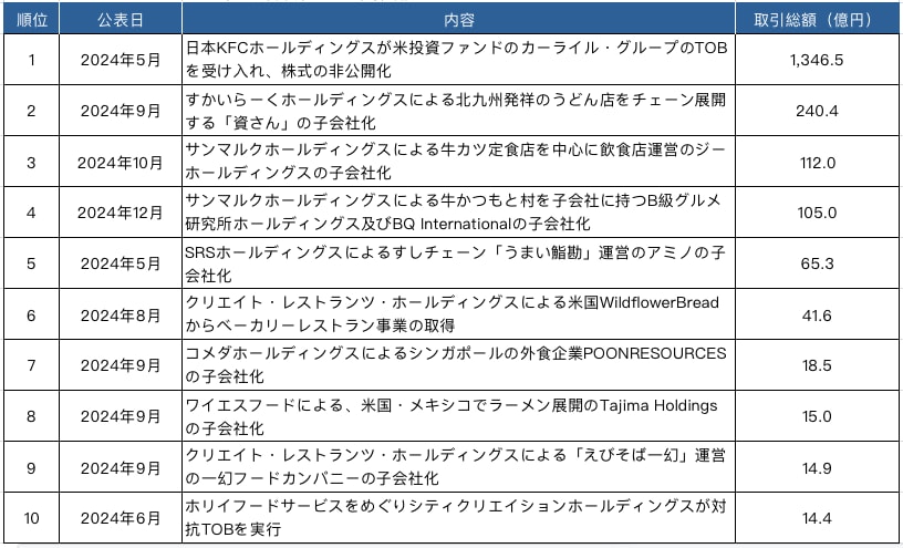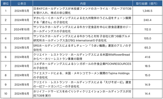 2024年の同業界のM&A件数は85件と23年比で44%増え、新型コロナウイルスの感染拡大前の19年(101件)以来、5年ぶりの高水準となった。このうち、取引総額が最も多かったのは、米カーライル・グループが日本KFCホールディングスの完全子会社化に向けたTOB(株式公開買い付け)で1346億円に達した。