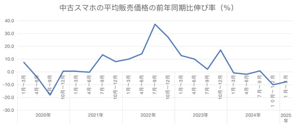 1~3月期の中古スマホの平均販売価格は前年同期に比べて7.9%下落し、1万9149円だった。下落率は前期(24年10~12月期)より縮小したものの、下落幅はなお大きい。23年10~12月期まで10四半期連続で価格が上昇してきた反動から中古価格は軟調な状況が続いている。1~3月期は、中古スマホで約6万8000件の取引があった(平均販売価格を含めてヤフオクのみの集計)。