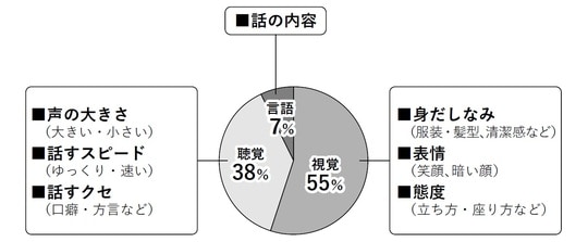つまり、人は言語情報=話の内容そのものよりも、視覚情報=見た目や表情などと聴覚情報=声のトーンや速さという2つを重視しており、この2つで人に与える影響の9割以上を占めています。