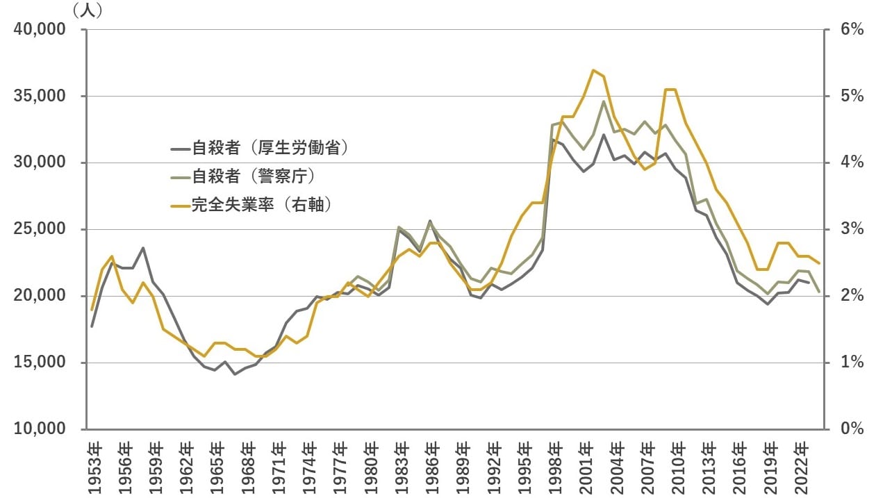 自殺の原因は健康問題が1番多いが、2番目に多いのが経済・生活問題だ。1978年から2024年までの47年間の完全失業率と自殺者数(警察庁)の相関係数は0.91と完全一致の1に近い強い正の相関がある。自殺者数の前年同月比は2023年11月から2025年3月暫定値まで17ヵ月連続して減少している。2024年は失業率が2023年の2.6%から2.5%へ低下したので、自殺者数の減少と同方向の動きになった。