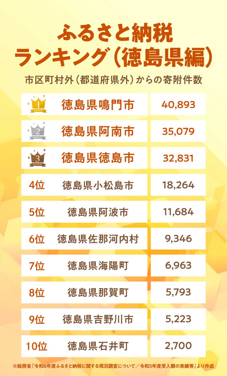 日本の地方自治体を支援するための寄付制度である「ふるさと納税」。楽しみなのはやっぱり返礼品。寄付先の自治体から地域の特産品や名産品の数々をゲットできて、しかも地域貢献までできると一石二鳥。今回は総務省がまとめた「2023年度の市区町村外からの寄付件数」に基づいて「徳島県」のふるさと納税ランキングを発表。寄付件数の多い順にベスト10を発表します。