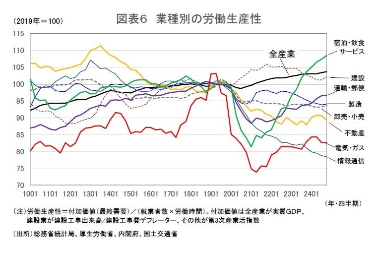 また、労働生産性を業種別にみると、コロナ禍以降、上昇基調が明確となっているのは、宿泊・飲食サービス業、運輸・郵便業の2業種に限られ、製造業、情報通信業は低下傾向が続いている。また、労働生産性の水準がコロナ禍前(2019年平均)を上回っているのは宿泊・飲食サービス業、建設業の2業種である(図表7)。