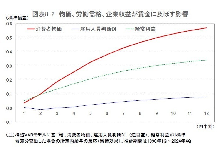 ここで、労働需給、企業収益、物価が賃金にどのような影響を与えるかを定量的に把握するために、多変量自己回帰(VAR)モデルを推計した2。推計結果をみると、賃金への影響が最も大きいのは物価(消費者物価)で、企業収益(経常利益)、労働需給(有効求人倍率)がそれに続く形となっている。有効求人倍率が近年、労働市場全体の需給バランスを反映しなくなっている可能性があることを踏まえ、有効求人倍率の代わりに雇用人員判断DIを用いても、消費者物価が賃金に及ぼす影響が最も大きいことは変わらない(図表9-1、2)。