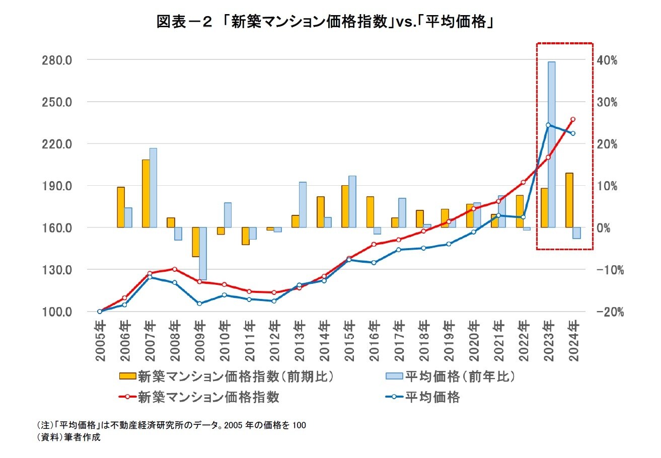 (2)「新築マンション価格指数」と「平均価格・㎡単価」(不動産経済研究所公表)の比較