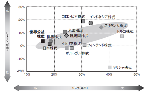 同様にグローバル分散投資型の株価指数である世界公益株式が世界株式よりもさらにリスクが低かったことも認識できます。世界の公益企業の業績が世界株式に含まれるすべての企業の業績よりも相対的に安定していたため、その特性が価格に反映されたことを表しています。