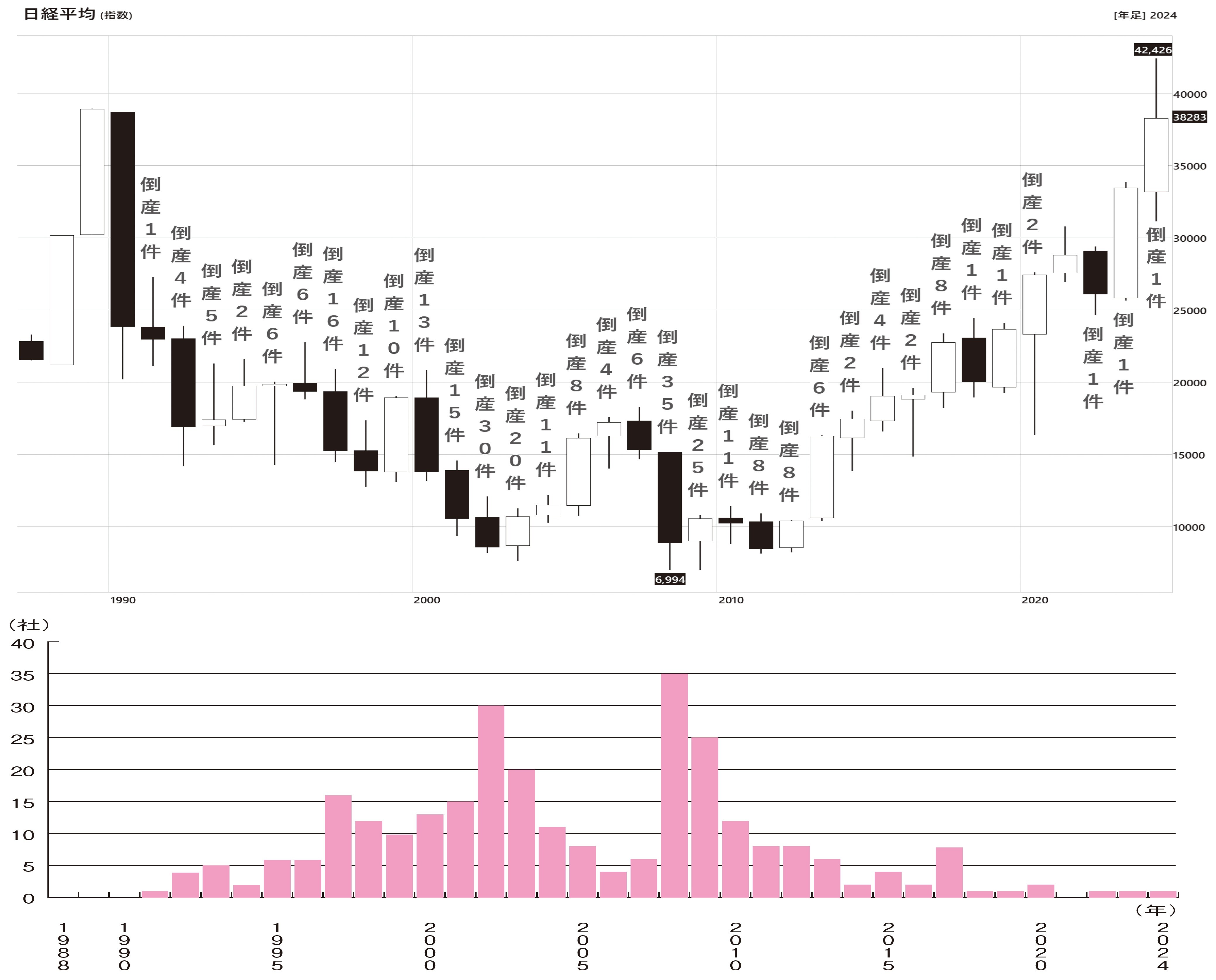 最後に日経平均株価の年足チャートに企業の倒産件数と倒産件数の棒グラフを書き込んだチャート[下記図表]を見てみましょう。株価暴落で株価が下がれば下がるほど、倒産件数が増えていることがわかります。