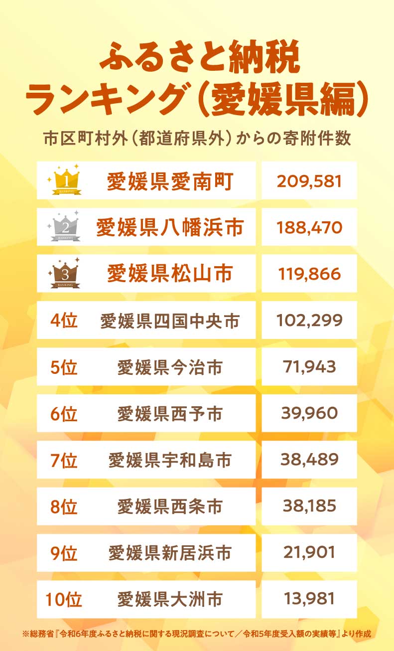日本の地方自治体を支援するための寄付制度である「ふるさと納税」。楽しみなのはやっぱり返礼品。寄付先の自治体から地域の特産品や名産品の数々をゲットできて、しかも地域貢献までできると一石二鳥。今回は総務省がまとめた「2023年度の市区町村外からの寄付件数」に基づいて「愛媛県」のふるさと納税ランキングを発表。寄付件数の多い順にベスト10を発表します。