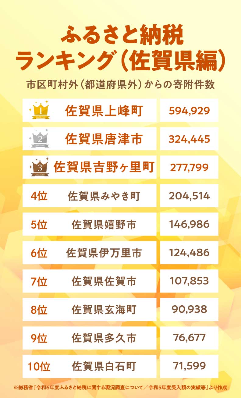 日本の地方自治体を支援するための寄付制度である「ふるさと納税」。楽しみなのはやっぱり返礼品。寄付先の自治体から地域の特産品や名産品の数々をゲットできて、しかも地域貢献までできると一石二鳥。今回は総務省がまとめた「2023年度の市区町村外からの寄付件数」に基づいて「佐賀県」のふるさと納税ランキングを発表。寄付件数の多い順にベスト10を発表します。
