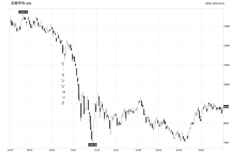 リーマンショック後の最安値 6,994.90円(−42.73%)