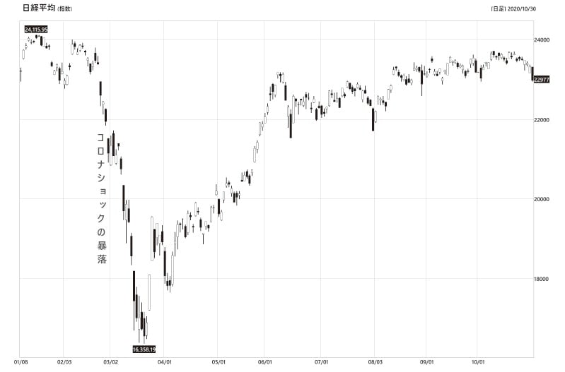 コロナショック後の最安値 16,358.19円(−31.92%)