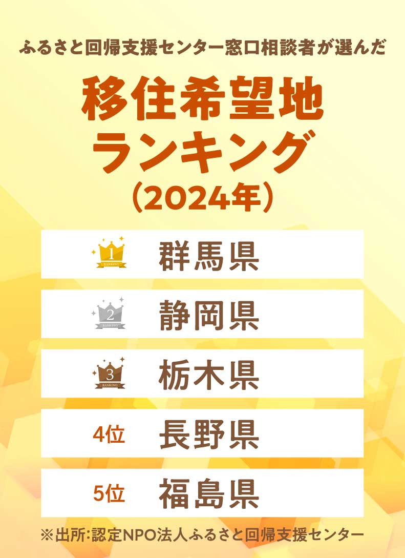 2位の静岡県は、同ランキングでコロナ禍の2020年から2023年まで4年間連続1位。3位の栃木県も、前回と同じランクであることから、首都圏からアクセスのいい県に根強い人気があるようです。
