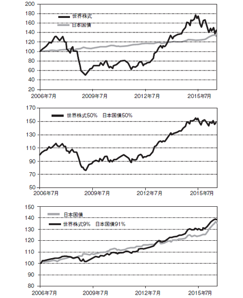 それでは、うまくバランスさせるにはどうすればいいのでしょうか? 世界株式の変動を日本国債の変動で中和するにはリスクの低い日本国債を世界株式よりも10倍多く保有すればいいのです。配分比率では世界株式9%と日本国債91%の配分がちょうどいい水準と言えます。この配分で保有した場合のリスク量は日本国債とほぼ同じで、パフォーマンスは年率0.2%引き上げることができています(図表2参照)。