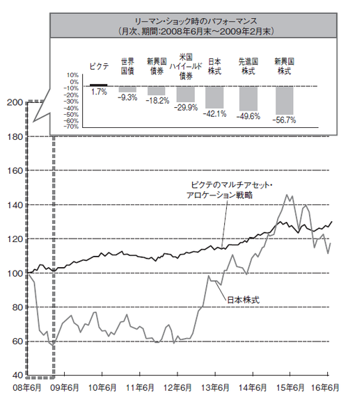 そうしたなか、リスク・バジェッティングの考え方で徹底的な分散投資を行い、ピクテ・グループが海外で提供する「ピクテ・マルチアセット・アロケーション戦略」は、このリーマン・ショックの時期にプラス1.7%という収益を上げることができています。