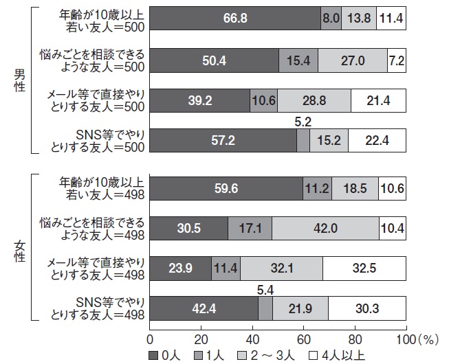 一方、ミドル・シニア未婚者の交流関係を見ると、人間関係が希薄化している様子も浮かび上がってきます。友人の数は、「年齢が10歳以上若い友人」は「0人」という回答が、男性では66.8%、女性では59.6%と約6〜7割に上ります。「悩みごとを相談できる友人」は男性では「0人」という回答が50.4%と最も多くなっていますが、女性では、「2〜3人」という回答が42.0%と最も多くなっています。