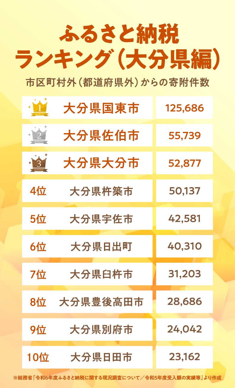 日本の地方自治体を支援するための寄付制度である「ふるさと納税」。楽しみなのはやっぱり返礼品。寄付先の自治体から地域の特産品や名産品の数々をゲットできて、しかも地域貢献までできると一石二鳥。今回は総務省がまとめた「2023年度の市区町村外からの寄付件数」に基づいて「大分県」のふるさと納税ランキングを発表。寄付件数の多い順にベスト10を発表します。