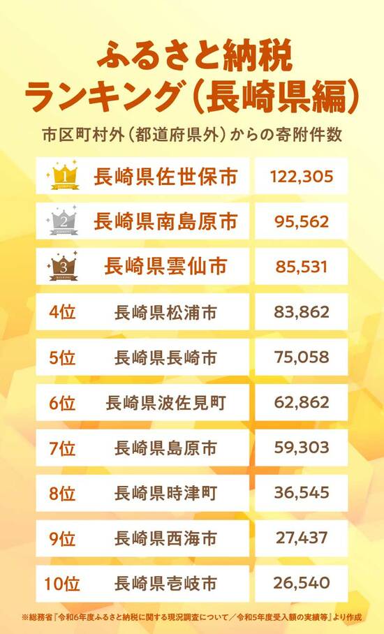 日本の地方自治体を支援するための寄付制度である「ふるさと納税」。楽しみなのはやっぱり返礼品。寄付先の自治体から地域の特産品や名産品の数々をゲットできて、しかも地域貢献までできると一石二鳥。今回は総務省がまとめた「2023年度の市区町村外からの寄付件数」に基づいて「長崎県」のふるさと納税ランキングを発表。寄付件数の多い順にベスト10を発表します。