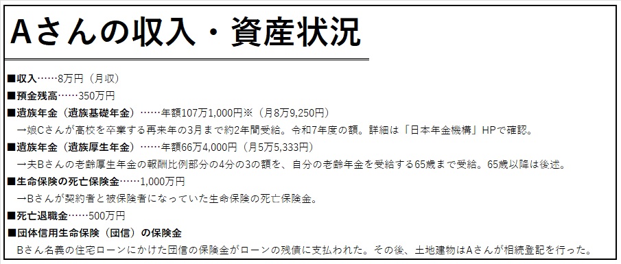 Aさんは事務系のパートで働いてはいたものの、月収はわずか8万円。遺族年金があるとはいえ、これでは生活がままなりません。