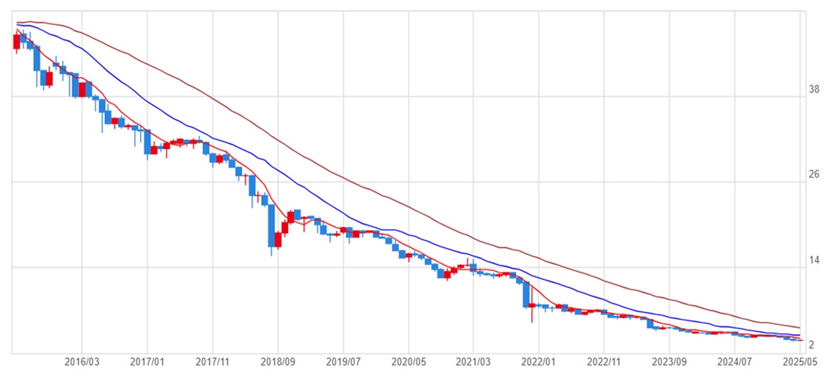 直近10年間のトルコリラの推移をみると、1リラ=50円台だった10年前から2025年時点では3円台まで下落しています。