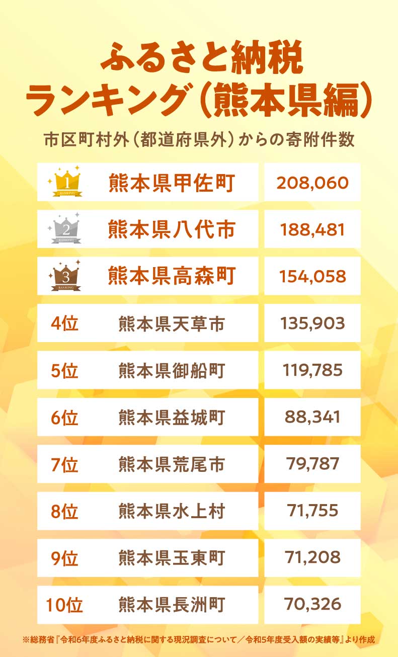 日本の地方自治体を支援するための寄付制度である「ふるさと納税」。楽しみなのはやっぱり返礼品。寄付先の自治体から地域の特産品や名産品の数々をゲットできて、しかも地域貢献までできると一石二鳥。今回は総務省がまとめた「2023年度の市区町村外からの寄付件数」に基づいて「熊本県」のふるさと納税ランキングを発表。寄付件数の多い順にベスト10を発表します。
