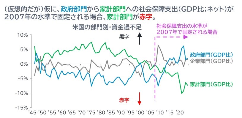 この点を深堀りしてみます。米国の資金循環統計をみますと、米国は家計部門と企業部門は資金余剰で、赤字になっているのは政府部門だけです。