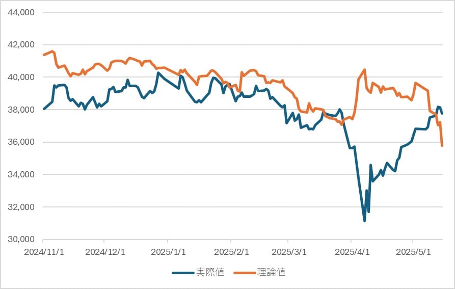 2024年秋以降、金利上昇を背景として理論値が右肩下がりとなり、2025年年初からは実際の株価も上値の重さが目立ち始め、そして3月には持ち合いの下限であった3万8,000円を割り込んだ。ここまでは実際の株価は理論値に沿った動きをしていたが、4月のトランプ関税発動以降、実際の株価が急落するなか、理論値は上昇した。