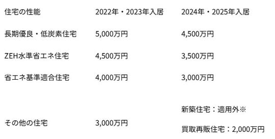 ※一般の新築住宅のうち、令和5年12月31日までに建築確認を受けたものまたは令和6年6月30日までに建築されたものは、借入限度額を2,000万円として10年間の控除が受けられます。ただし、特例居住用家屋に該当する場合は、令和5年12月31日までに建築確認を受けたものが対象となります。