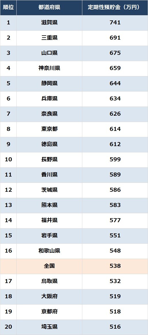 キャリアアップ 給与 シェア Tweet [連載] 統計から紐解く日本の実情…統計・調査・ランキング資料 【ランキング】都道府県「預貯金額」ランキング〈家計調査報告(貯蓄・負債編)2024年(令和6年)平均結果〉 SGO編集部 2025.5.30 統計 調査 都道府県「定期性預貯金」ランキング…1~20位 出所:総務省『家計調査報告(貯蓄・負債編)2024年(令和6年)平均結果-(二人以上の世帯)』より作成