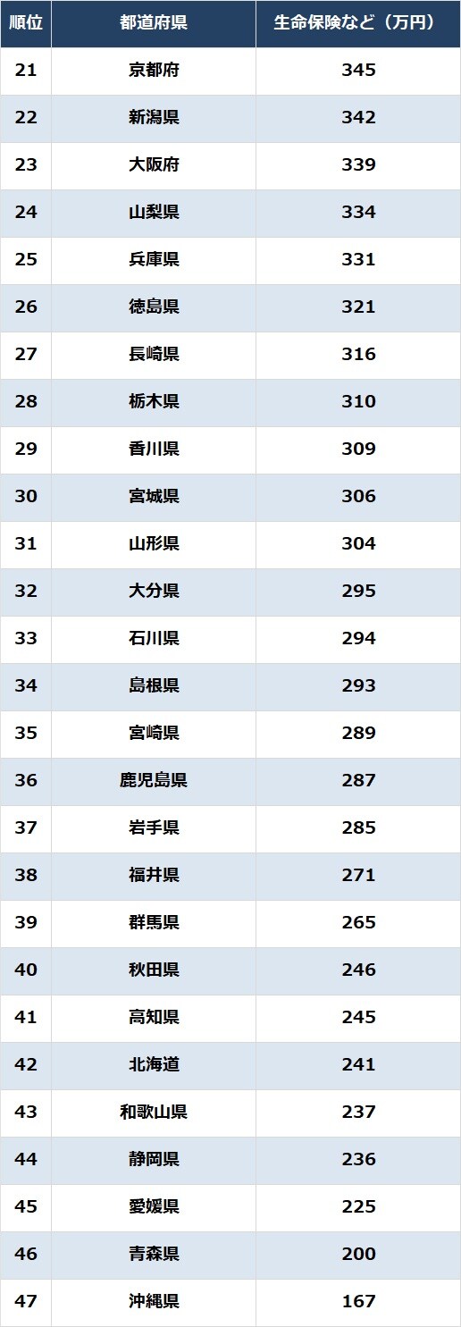 キャリアアップ 給与 シェア Tweet [連載] 統計から紐解く日本の実情…統計・調査・ランキング資料 【ランキング】都道府県「貯蓄型生命保険」ランキング〈家計調査報告(貯蓄・負債編)2024年(令和6年)平均結果〉 SGO編集部 2025.5.30 統計 調査 都道府県「貯蓄型生命保険」ランキング…21~47位 出所:総務省『家計調査報告(貯蓄・負債編)2024年(令和6年)平均結果-(二人以上の世帯)』より作成