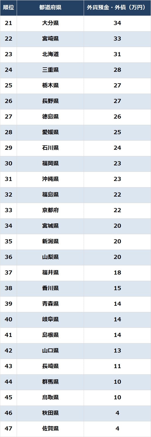 キャリアアップ 給与 シェア Tweet [連載] 統計から紐解く日本の実情…統計・調査・ランキング資料 【ランキング】都道府県「投資資産額」ランキング〈家計調査報告(貯蓄・負債編)2024年(令和6年)平均結果〉 SGO編集部 2025.5.30 統計 調査 都道府県「外貨預金・外債」ランキング…21~47位 出所:総務省『家計調査報告(貯蓄・負債編)2024年(令和6年)平均結果-(二人以上の世帯)』より作成