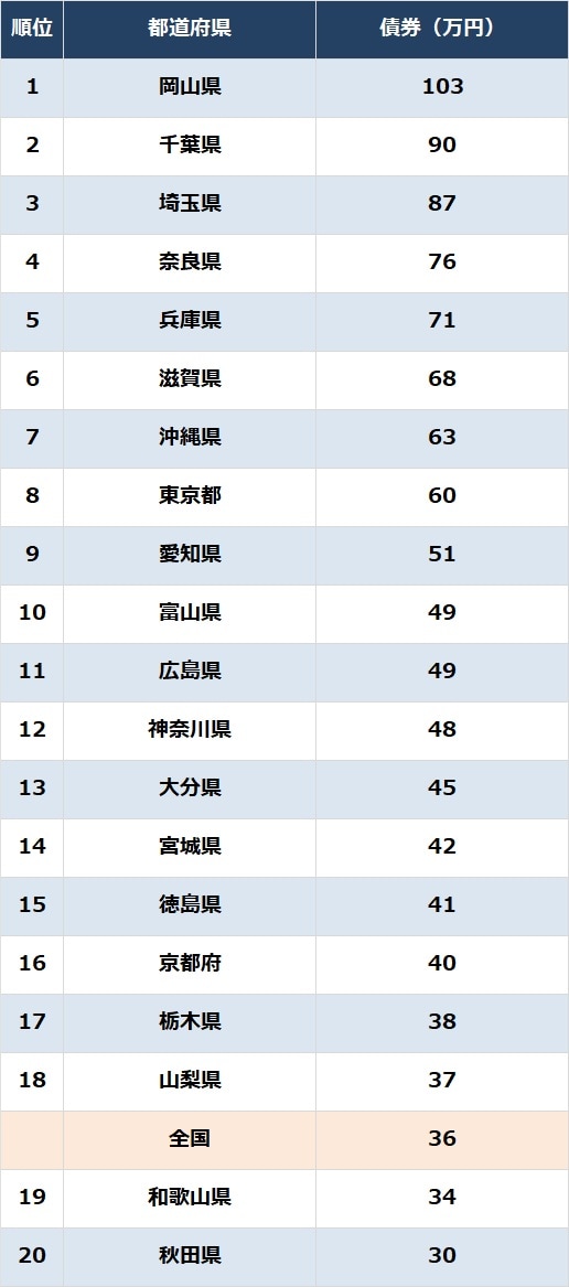 キャリアアップ 給与 シェア Tweet [連載] 統計から紐解く日本の実情…統計・調査・ランキング資料 【ランキング】都道府県「投資資産額」ランキング〈家計調査報告(貯蓄・負債編)2024年(令和6年)平均結果〉 SGO編集部 2025.5.30 統計 調査 都道府県「債券」ランキング…1~20位 出所:総務省『家計調査報告(貯蓄・負債編)2024年(令和6年)平均結果-(二人以上の世帯)』より作成
