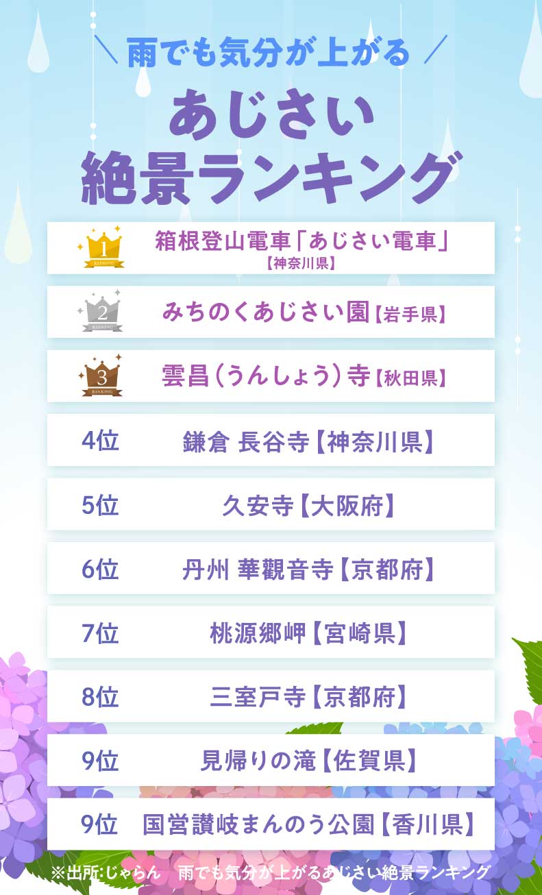 現在、梅雨まっただなか。「また今日も雨か……」と憂鬱になっている人も多いかもしれません。しかし、梅雨は「あじさい」の季節。道に咲くあじさいを見つけると、少しだけ心が晴れやかになりませんか? そこで今回、株式会社リクルートが運営する旅行情報サイト『じゃらんニュース』が行ったアンケート調査をもとに、思わず見惚れる「あじさい」絶景スポットをランキング形式で紹介します。※最後にTOP10の早見表あり。
