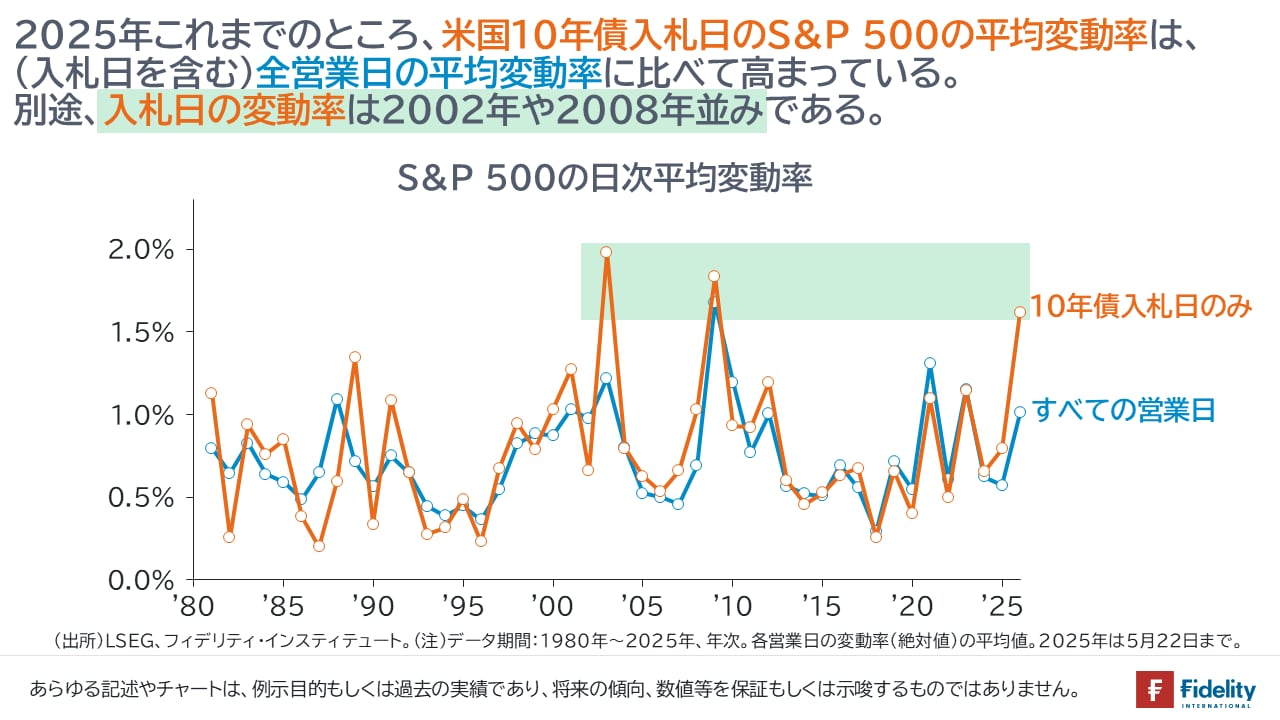 また、米国債入札日の株価変動率【オレンジ】だけに注目すると、直近の水準は2002年や2008年と肩を並べます。2002年は米国企業の会計スキャンダルが生じ、株式市場が調整していた頃です。2008年は世界金融危機時です。要因は別として2025年の(入札日における)株価変動率は「株式市場の大幅調整時並みに高い」と言ってよさそうです。
