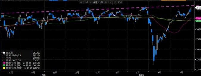 TOPIXのチャートはさらに良好だ。2024年夏の暴落以降、8月末からの動きをみると、緩やかだが高値切り上げ型のトレンドを維持している。3月下旬につけた直近の高値、2,821ポイントまであと10ポイント足らず。これを抜ければ一段と高値切り上げ型の基調が強まる。