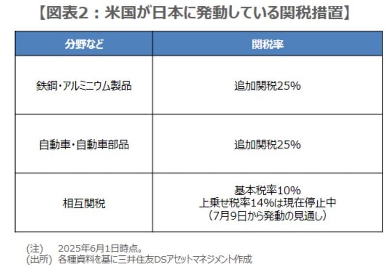 現時点で、米国が日本に発動している関税措置は、鉄鋼・アルミニウム製品への追加関税が25%、自動車・自動車部品への追加関税が25%、相互関税の基本税率10%です(図表2)。なお、相互関税の上乗せ税率14%は現在停止中で、7月9日から発動される見通しとなっています。今後の焦点は、米国が日本の交渉カードをどのように受け止め、一連の関税措置の見直しを、どの程度進めるかが焦点になると考えます。