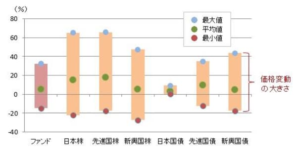 これらは個人が投資信託を確認する際の大切なポイントなので、2014年12月以降は、すべての運用報告書に同一の形式で図示することが定められました。③価格変動の大きさは、他の主要資産とともに一目で比較できるようになりました。図表2は、オーストラリアの債券を中心に投資するファンドの例を示しています。図からは、先進国債(世界の先進国債券に幅広く投資する指数)と同程度の価格変動の大きさであることがわかります。