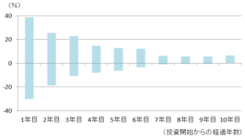 下図は、過去20年間において、日本債券、日本株式、外国債券、外国株式の主要4資産に毎月均等に投資した際の、投資を始めてからのリターンの分布をみたものです。投資対象を分散して、時間分散による長期投資をおこなう効果が見て取れます。リターンのブレが小さくなり、安定することがわかります。